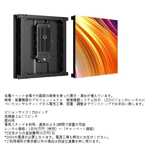 | 平素より大変お世話になっております。 映像機器システム社の上原です。 近年、イベント演出の主役として欠かせない存在となった「LEDビジョン」。 今までは液晶ディスプレイやプロジェクターが主流でしたが、最近ではレンタルの普及により、展示会、ライブ、製品発表会、社内の周年行事など幅広い場所で使用される機会を増やしています。 しかし、ピッチサイズといったワードや液晶ディスプレイとの違いなど不明点も多くあるのではないでしょうか。 そこで今回はLEDビジョンの特徴についてご説明いたします。 LEDビジョンの画質を左右する重要な要素が「ピッチサイズ(LED素子の中心間の距離)」です。 一般的に、1.9mm〜2.6mmピッチは、2〜3mの至近距離から見る展示会ブースや会議室など、屋内の用途に最適です。一方、2.7mm〜3.9mmピッチは、5m以上離れた場所から見るステージやイベントでの使用に適しています。 一見、「ピッチが細かければ細かいほど良い」と思われがちですが、実際には「どのくらいの距離から見るか(視認距離)」や「どのような演出を行うか」によって最適なサイズは異なります。そのため、導入にあたっては視認距離を正確に把握することが重要です。 液晶ディスプレイとの最大の違いは明るさにあります。 液晶ディスプレイの場合300~500cd/㎡ほどの輝度ですが、LEDの場合、800~1500cd/㎡ほどの輝度であるためLEDの方が高輝度、高精細な映像を映し出すことが可能です。 弊社では、屋内用の2.6mmピッチのパネル、屋内外兼用の2.9mmピッチのパネルを所有しており幅広く対応することが可能です。 お客様の予算や希望に合わせて最適なサイズや設営方法などをご提案させていただきます。 LED以外にも映像機材、音響機材のレンタルを行っておりますので機材レンタルの際は弊社までご相談いただければ幸いです。 |